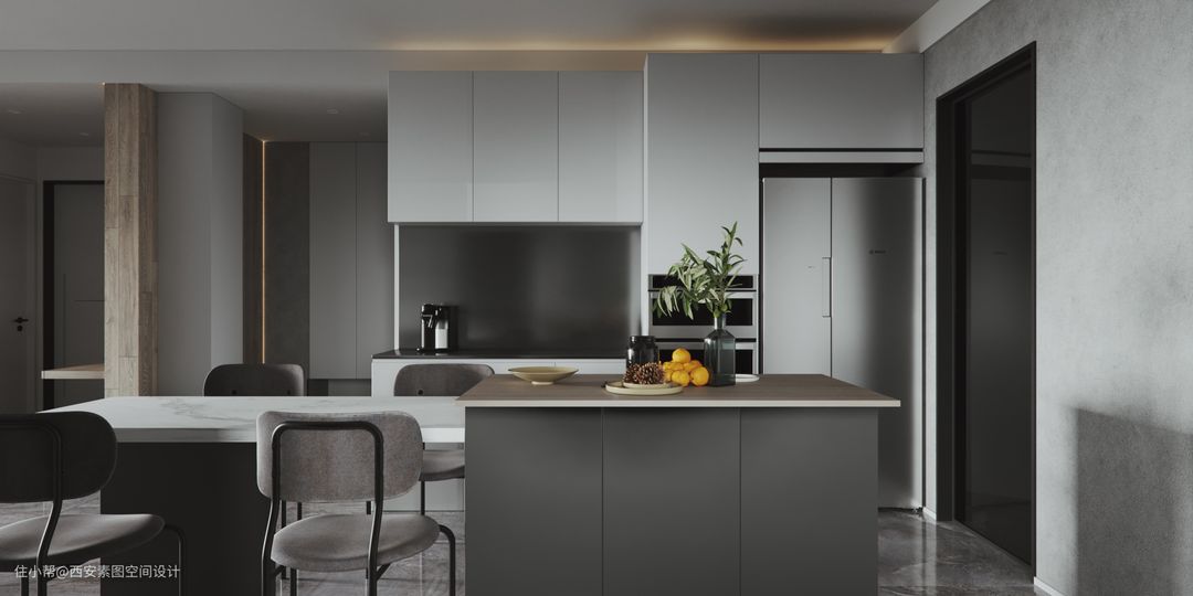 餐厨更多考虑了动线和实用性,L型的厨房提高了空间的利用率,厨房出口即是餐桌和岛台一体的设计,这里岛台的加入了为厨房提供了便利。