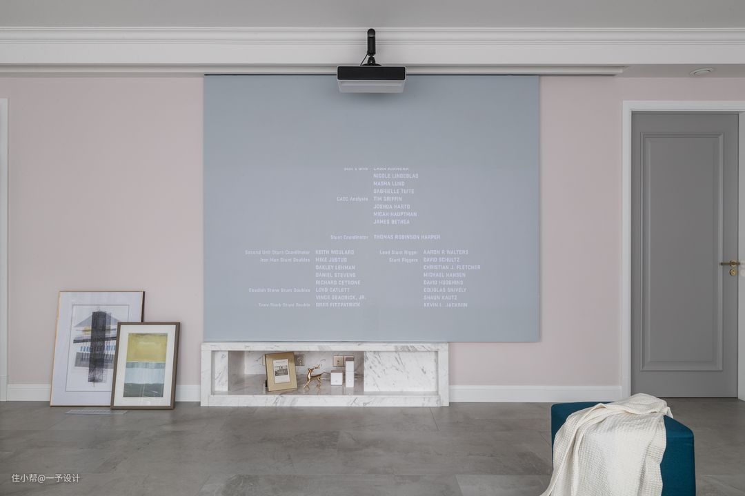 ▲客厅地面铺设灰色浅花纹复古砖,木门和门套居然没有用到同一种颜色,用粉色作为墙面色调,其实在调色的时候的一个失误造成的,对于空间美学的要求,一个空间内 冷暖色调不宜同时出现 后期入住后反而暖色墙面会更加温馨,更舒适,蓝黄色抱枕、黄铜茶几和装饰品、泼色画等等让整个空间活跃起来。