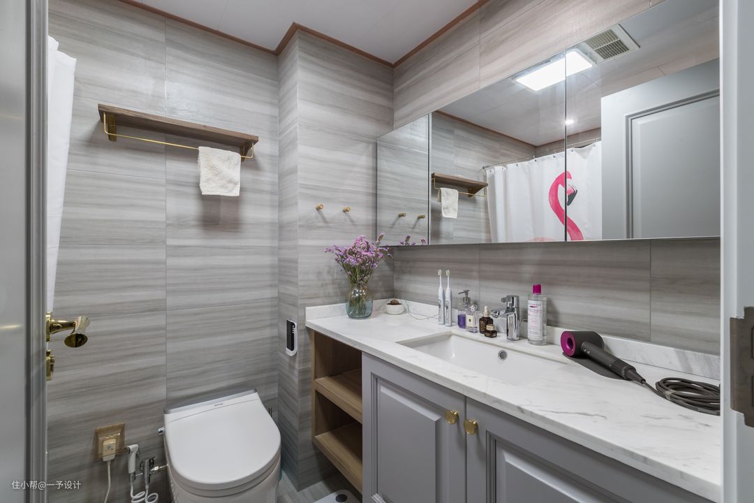 ▲卫生间区域墙面砖选的比较便宜的通体砖,本来采光不是特别好,没有去考虑特别暗的瓷砖,这个可以作为控制预算的一个方面。有需要了解的可以私信我,给你们意见。对于化妆品东西比较多,还是很有必要做一个镜柜的。