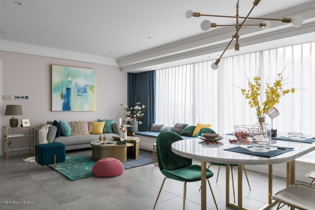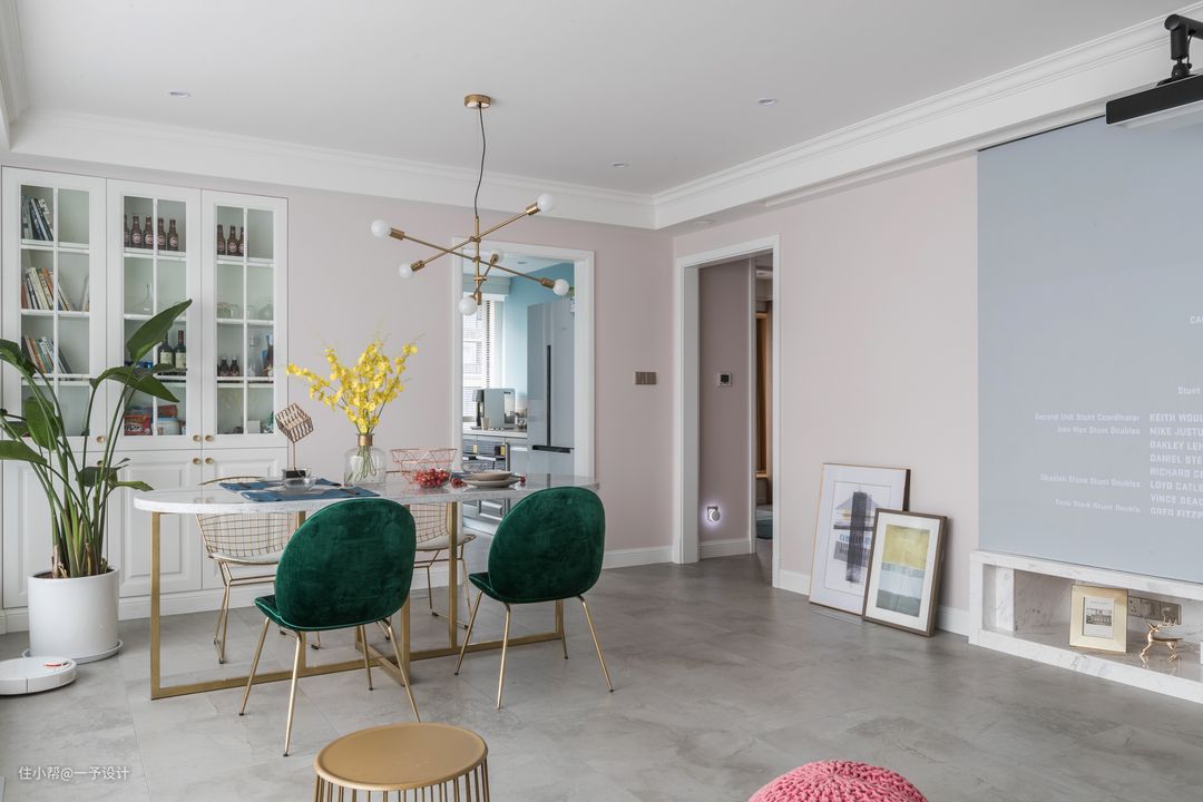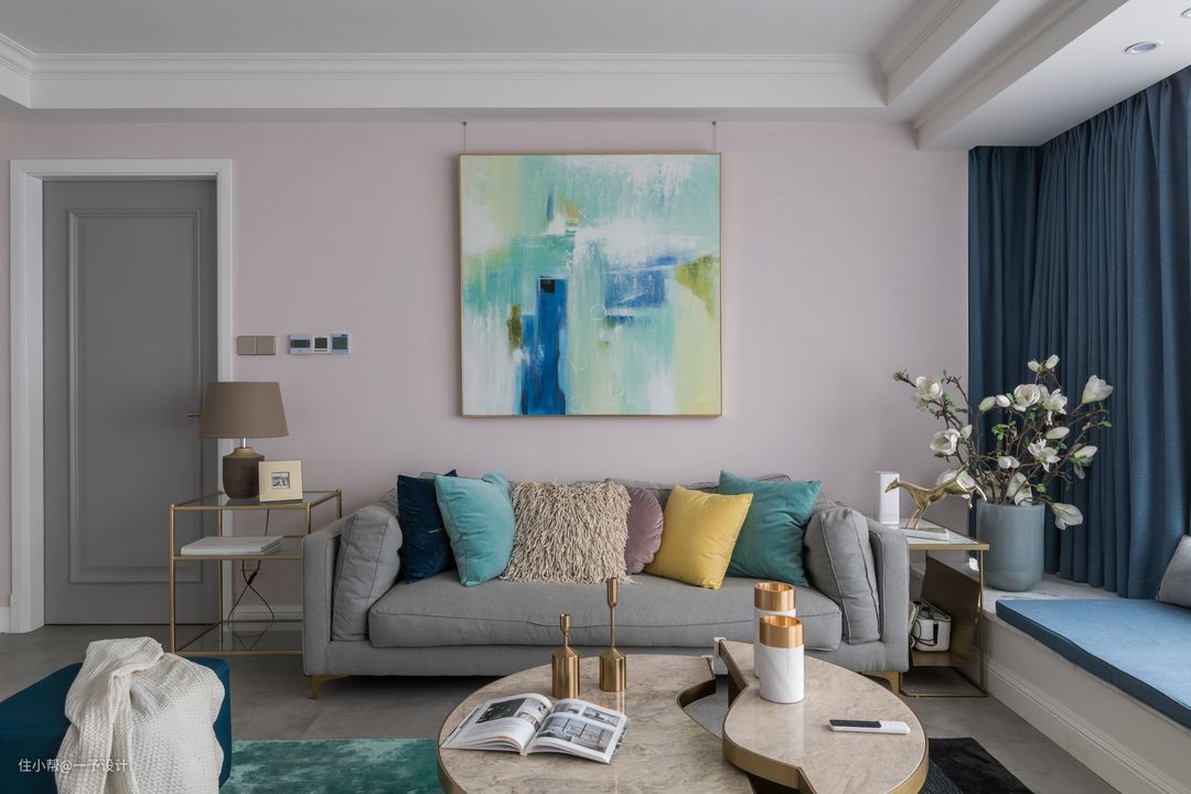 ▲客厅地面铺设灰色浅花纹复古砖,木门和门套居然没有用到同一种颜色,用粉色作为墙面色调,其实在调色的时候的一个失误造成的,对于空间美学的要求,一个空间内 冷暖色调不宜同时出现 后期入住后反而暖色墙面会更加温馨,更舒适,蓝黄色抱枕、黄铜茶几和装饰品、泼色画等等让整个空间活跃起来。