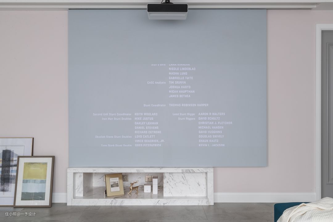 ▲因为电视背景后面是一个柜子,所以这个电视墙是可以移动的,背后藏了很多零食,哈哈 表面涂刷的是投影漆,效果也还不错,对于没有太多画面追求的人来说,激光投影的效果已满足大部分人的要求了。