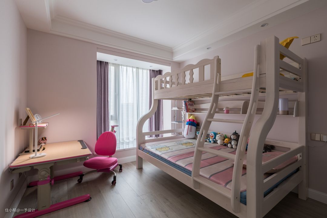 ▲女孩子家的房间 还是以粉色墙面为基调,高低铺比较省空间,留出了很多空间作为活动空间。