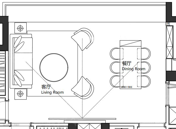 ▲通常这样的户型有些设计师都会把次卧外面的那堵墙做成电视背景,这样就破坏了整一个客餐厅的空间感。 如下图: