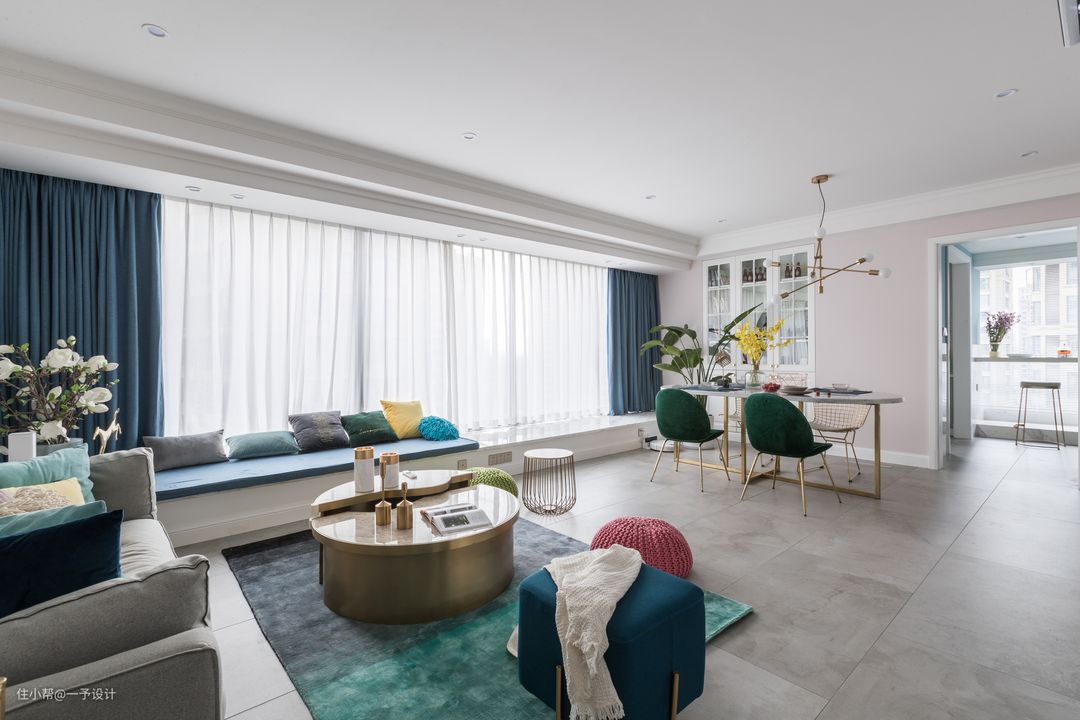 ▲客厅地面铺设灰色浅花纹复古砖,木门和门套居然没有用到同一种颜色,用粉色作为墙面色调,其实在调色的时候的一个失误造成的,对于空间美学的要求,一个空间内 冷暖色调不宜同时出现 后期入住后反而暖色墙面会更加温馨,更舒适,蓝黄色抱枕、黄铜茶几和装饰品、泼色画等等让整个空间活跃起来。