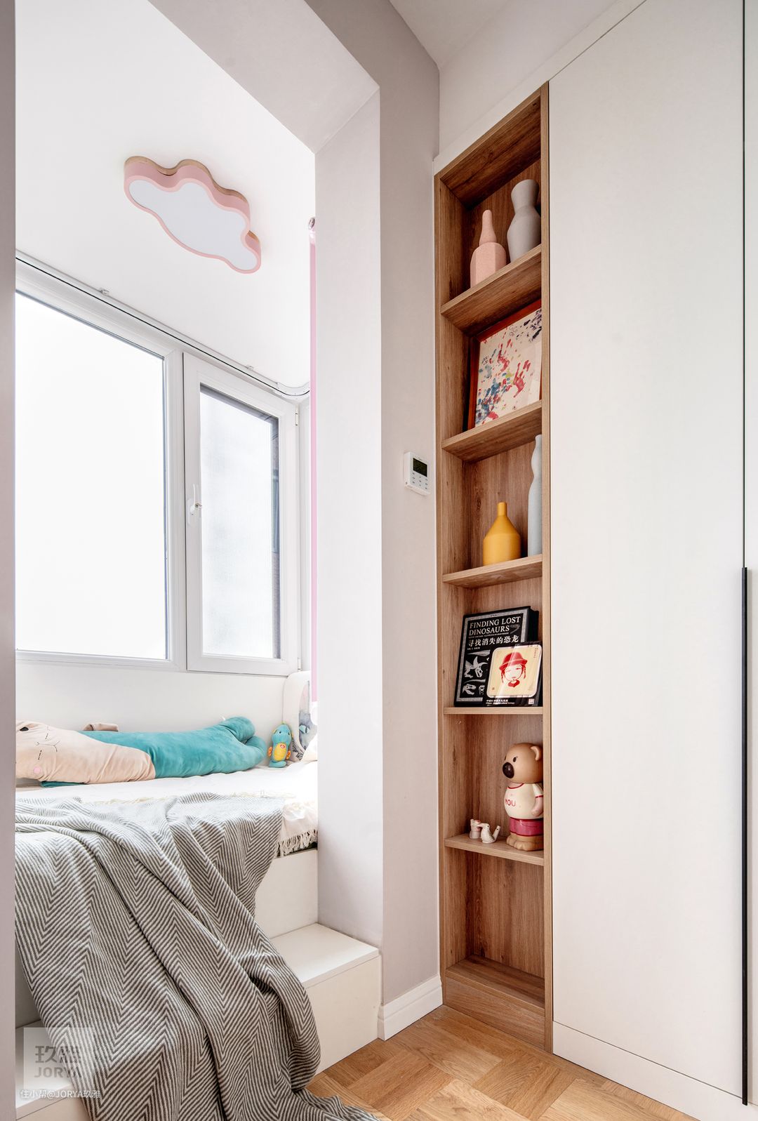 附:原始儿童房采光不好,阳台上的房门打开时才有光源,关闭房门没有任何光源,在儿童房与客厅之间的墙体上开了两个小洞,儿童房也算有了暗窗户。新建儿童房时为了引入光源也是煞费苦心。改造后儿童房除了有阳台光源外,面向客厅的整面推拉玻璃门都可以透光。