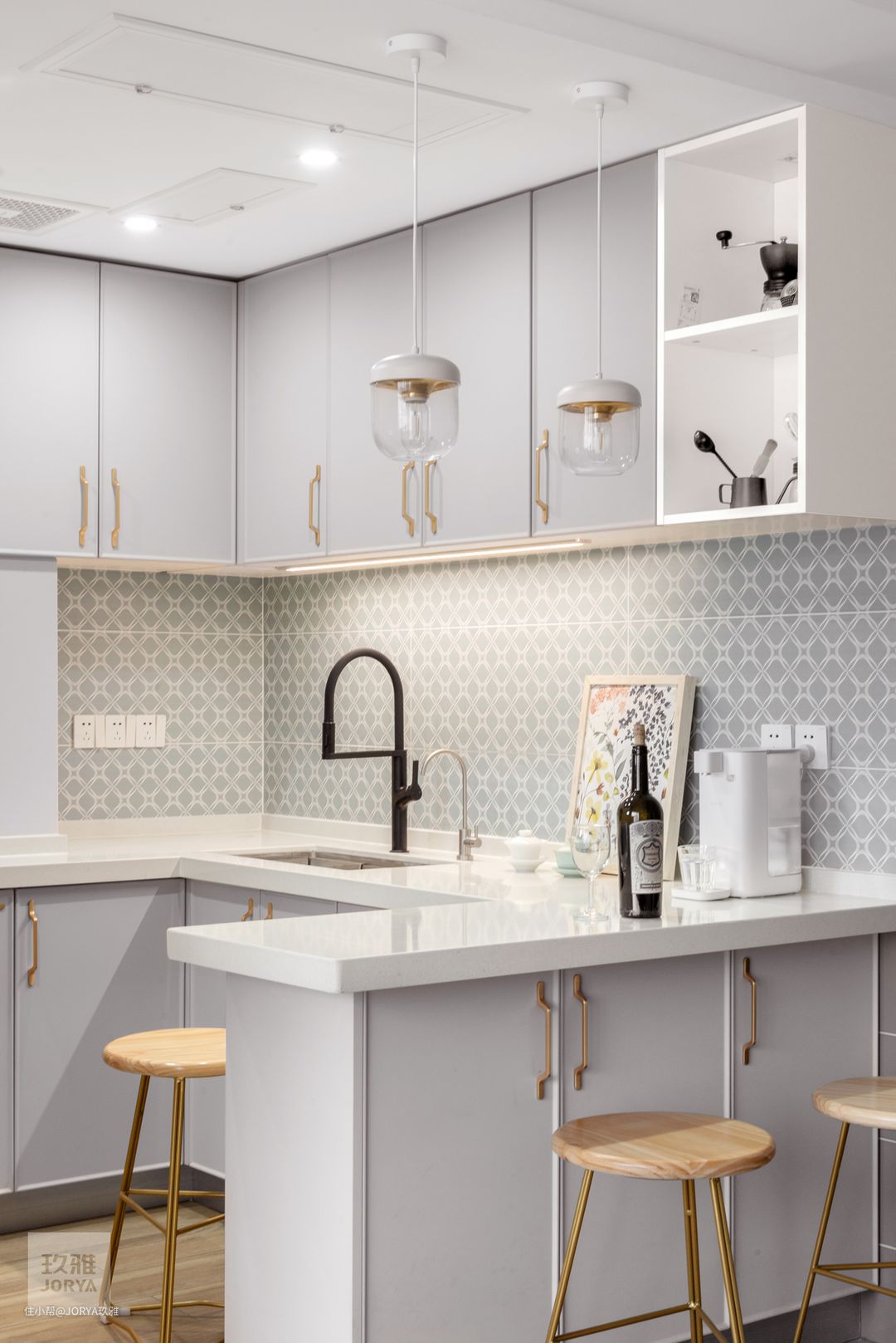 U型厨房,利用率最高,一家三口平时吃饭就在吧台上解决了。