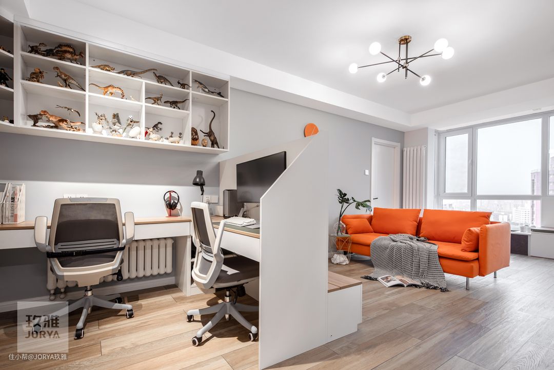 原始工作区只有一台电脑桌,与客厅分区不明确,调换了客厅沙发摆放方向,换来了独立双人办公区。