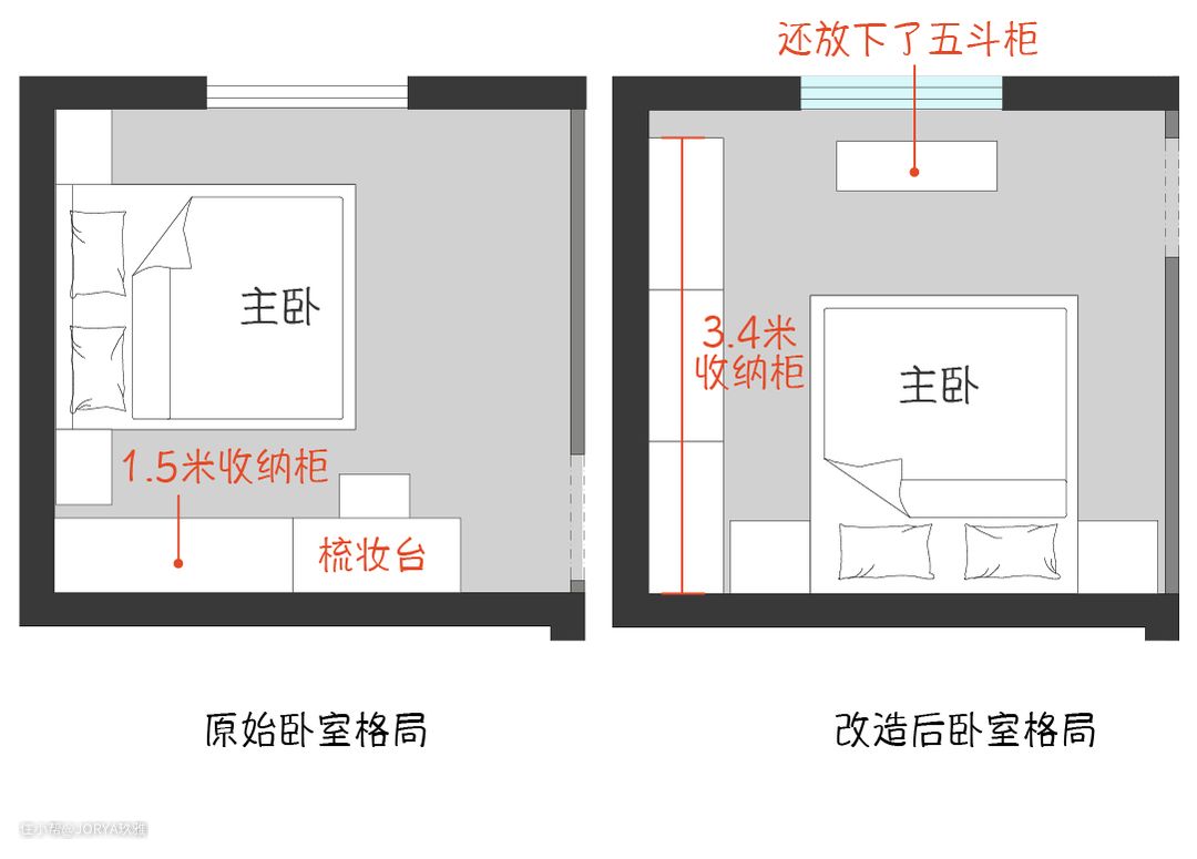 改变了主卧进门方向,调动床头方向,定制了3.4米长的收纳柜。