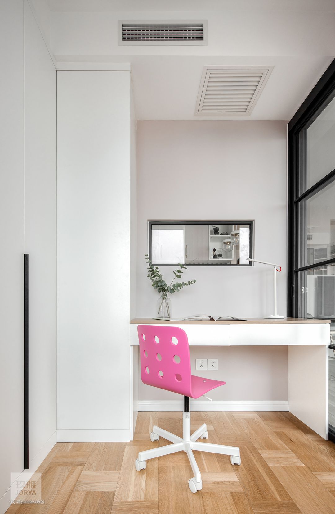 原始工作区只有一台电脑桌,与客厅分区不明确,调换了客厅沙发摆放方向,换来了独立双人办公区。
