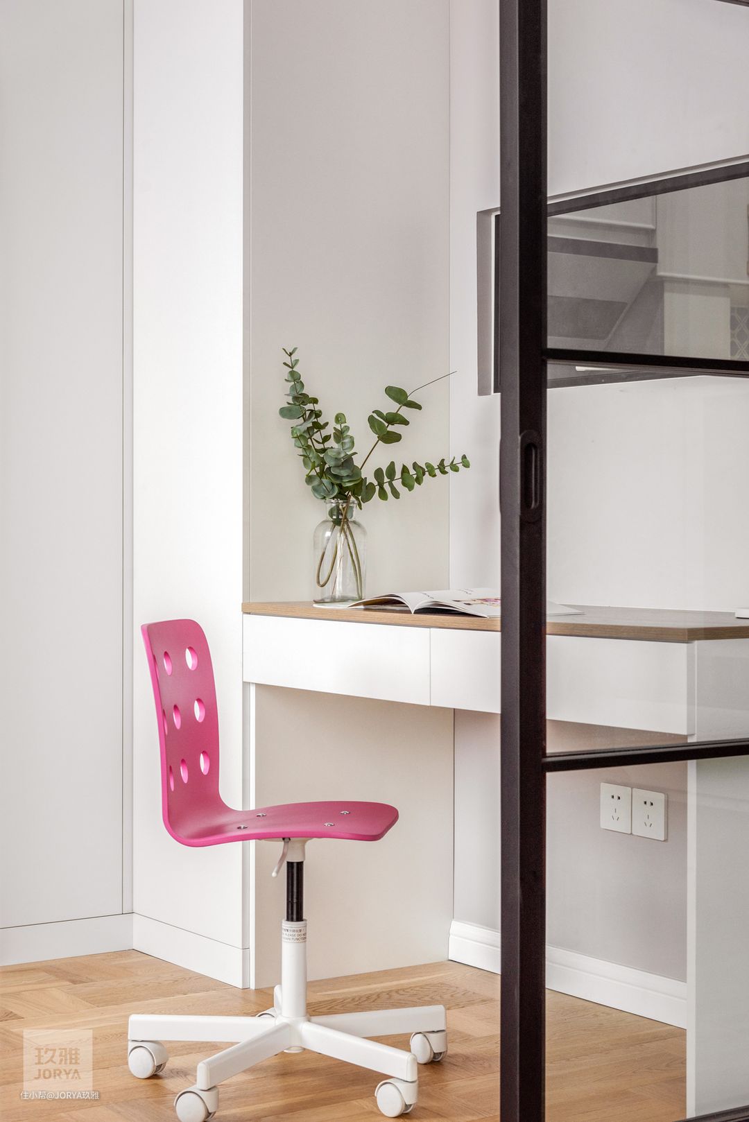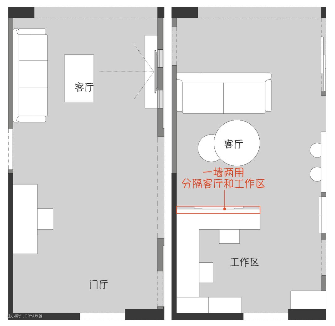 原始工作区只有一台电脑桌,与客厅分区不明确,调换了客厅沙发摆放方向,换来了独立双人办公区。