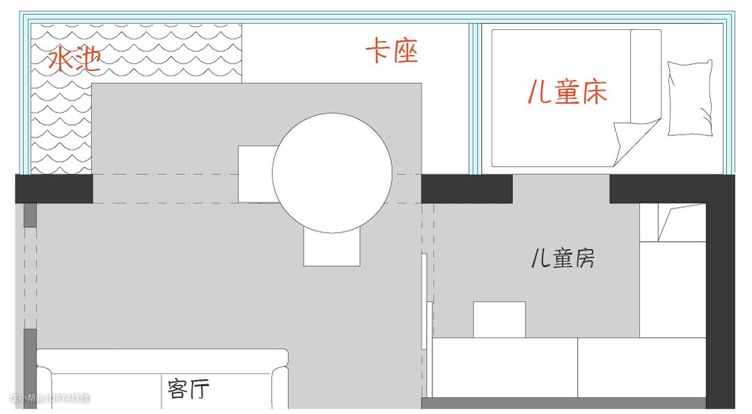 附:原始儿童房采光不好,阳台上的房门打开时才有光源,关闭房门没有任何光源,在儿童房与客厅之间的墙体上开了两个小洞,儿童房也算有了暗窗户。新建儿童房时为了引入光源也是煞费苦心。改造后儿童房除了有阳台光源外,面向客厅的整面推拉玻璃门都可以透光。