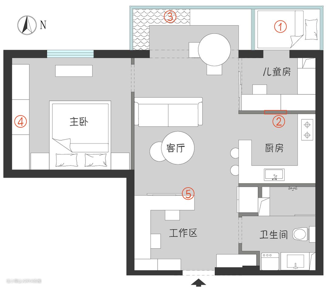 缺点是每个空间都比较小,除了客餐厅之外,其余的卫生间、厨房、儿童房、主卧,每个空间都非常小,并且还没有独立的办公区。一家三口,在阳台处隔出了一间儿童房,但是新建儿童房只能通过阳台进入,这样,阳台就沦为了通往儿童房的过道,对于58平米的小户型来看,7.5平米的落地阳台完全浪费掉了。