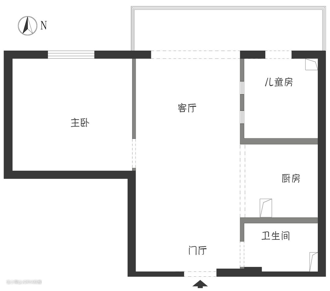 附:原始儿童房采光不好,阳台上的房门打开时才有光源,关闭房门没有任何光源,在儿童房与客厅之间的墙体上开了两个小洞,儿童房也算有了暗窗户。新建儿童房时为了引入光源也是煞费苦心。改造后儿童房除了有阳台光源外,面向客厅的整面推拉玻璃门都可以透光。