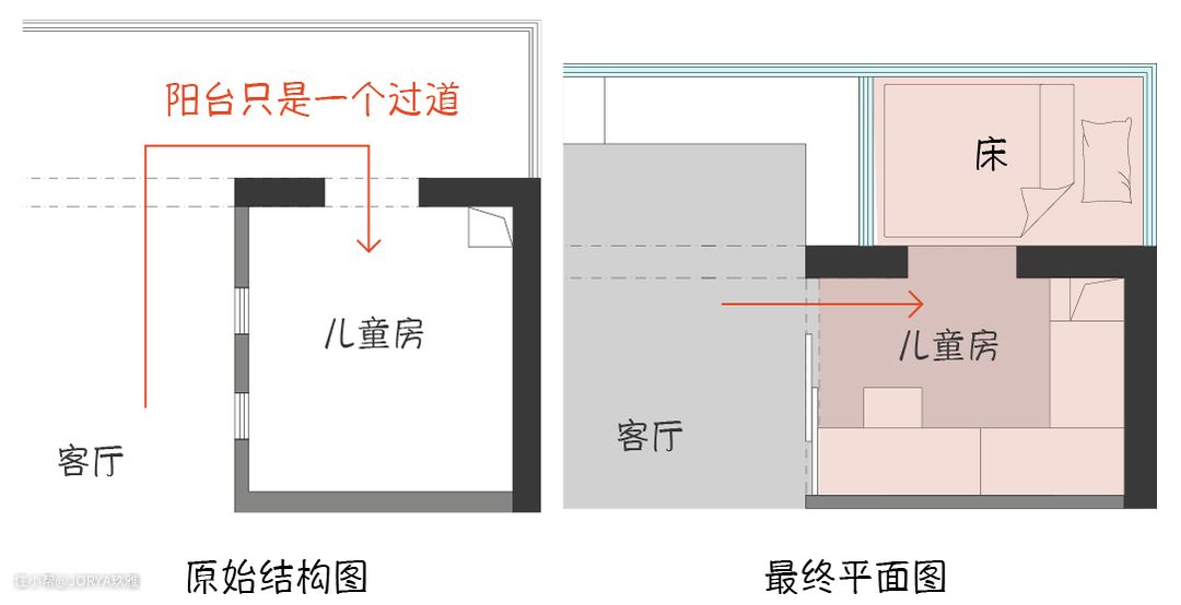 原始进儿童房动线是:客厅——阳台——儿童房。