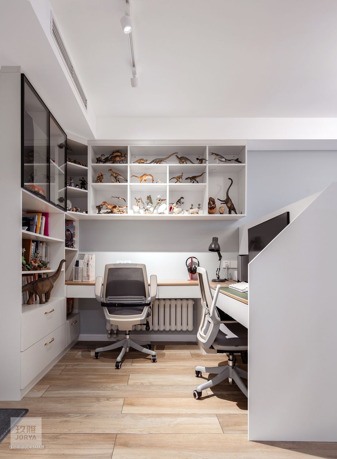 原始工作区只有一台电脑桌,与客厅分区不明确,调换了客厅沙发摆放方向,换来了独立双人办公区。