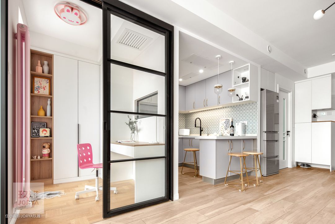 面向客厅的开放式厨房,没有任何窗户,客厅也成了厨房的唯一采光口,改造后在儿童房墙上开了一个洞,增加厨房的采光。