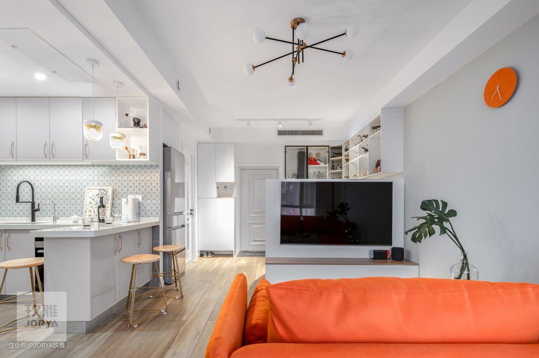 从阳台看向门厅的角度,每个空间都是开放相融的,但是每个空间都是独立的,开放厨房与客厅用吧台分隔、工作区与客厅用电视背景墙分隔、餐厅与客厅用沙发分隔。