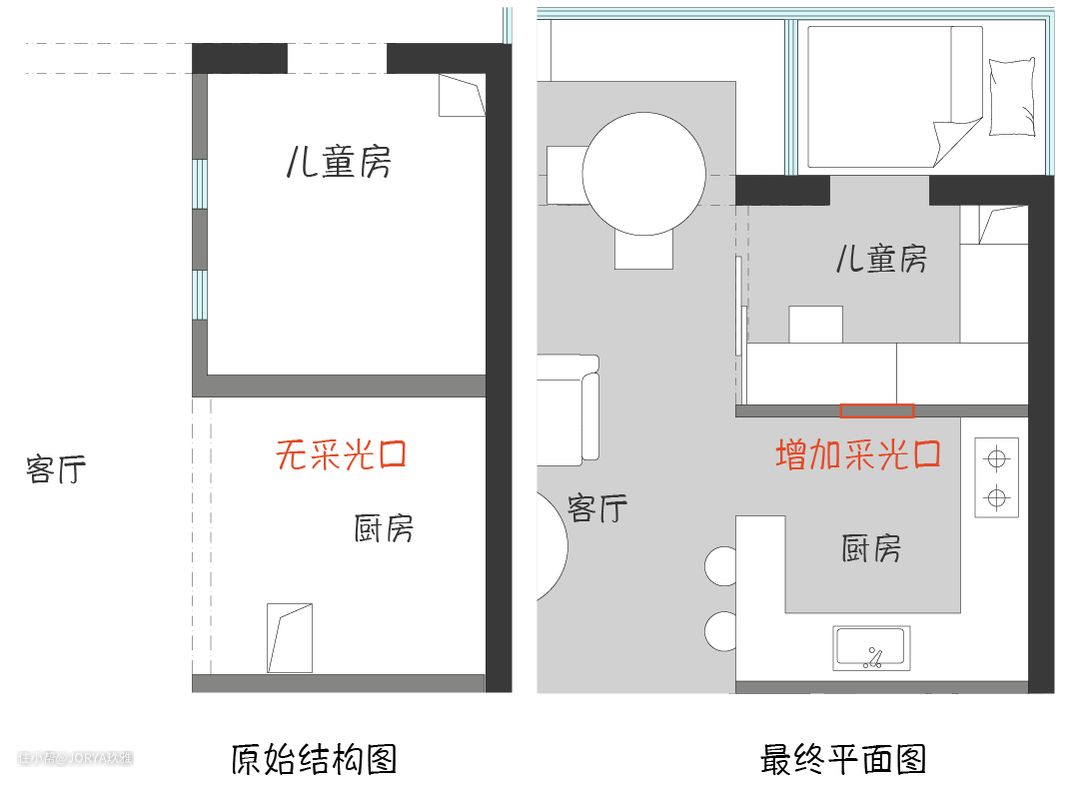 面向客厅的开放式厨房,没有任何窗户,客厅也成了厨房的唯一采光口,改造后在儿童房墙上开了一个洞,增加厨房的采光。