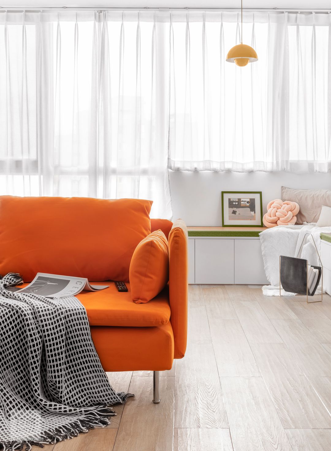 原始工作区只有一台电脑桌,与客厅分区不明确,调换了客厅沙发摆放方向,换来了独立双人办公区。
