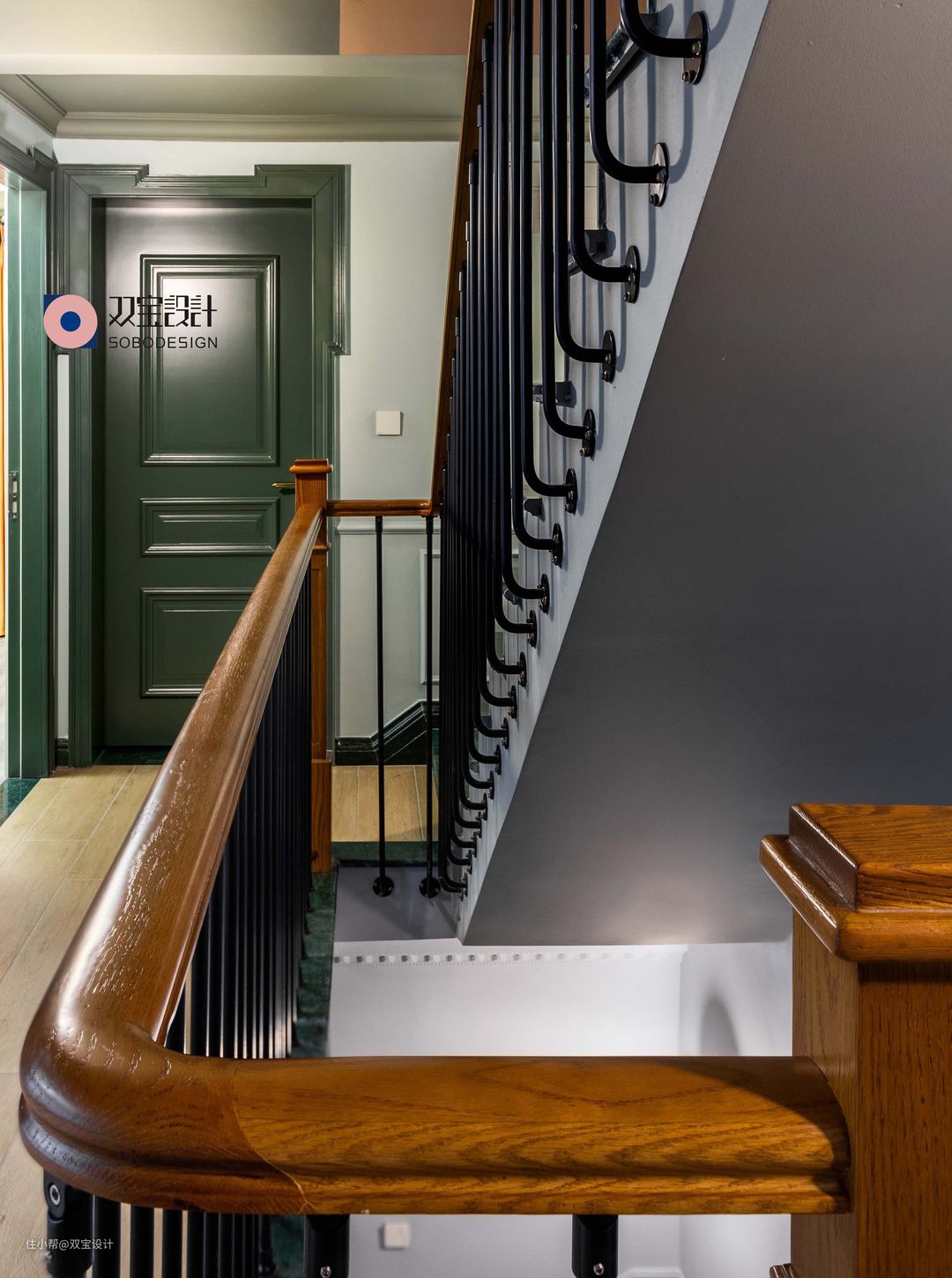 眼尖的小伙伴发现其实每一层楼的墙面色彩都有所不同,一楼是沉稳的墨绿色,两个小宝贝这层楼以雾霾蓝作为整体基调,这样的色调可以伴随小朋友一起成长,憧憬未来