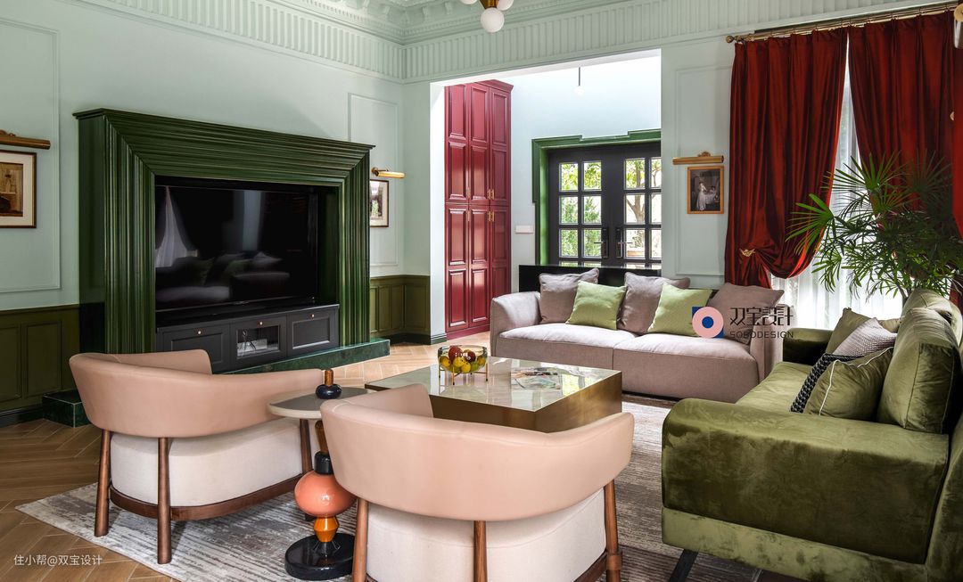 大面积的丝绒红窗帘是主色调,小面积绿色沙发作为辅助色,窗帘上的小天使金色窗帘壁勾也是首尾呼应,营造满目复古风情