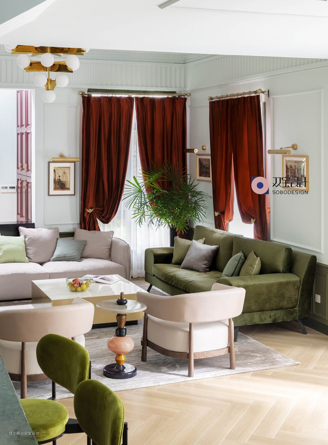 那近两年来把红绿配色升华出时髦“高级感”的,无疑就是GUCCI了。其实,GUCCI标志性的红绿条纹织带早在1950年代就问世了,为了迎合热衷于骑马的上流人士,Gucci常常会从马术中寻找灵感来源,而条纹织带的设计则是来自于传统马鞍下的红配绿马肚带 机缘巧合时间正好撞上了圣诞节,那小编就任性一点借着圣诞的热度发布,这套案例可谓极尽“花俏”本事,张扬,没有打算低调,搭配一些法式的石膏造型,红窗帘,绿门套,统统一块儿上阵,完全没有违和感,设计师在本期案例中的配色亦采用了“故宫色”,小编这就带领各位一起探访这个温馨柔和的家!