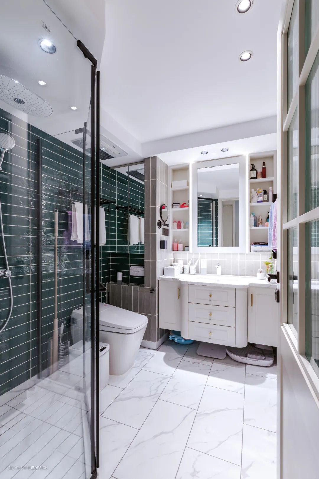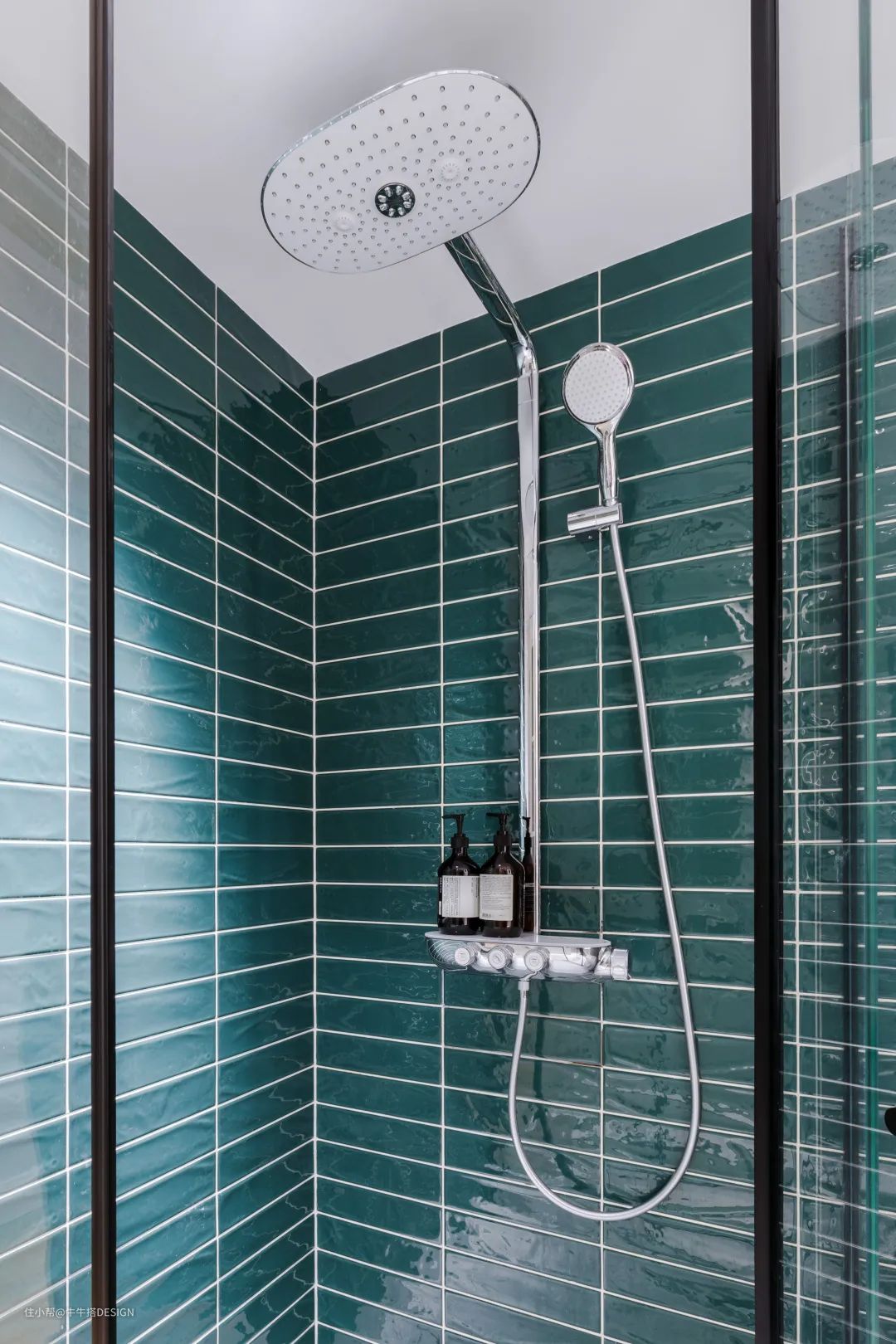 浴房墨绿色瓷砖背景,仿佛置入丛林沐浴,让身心的疲倦通过流水慢慢舒缓。