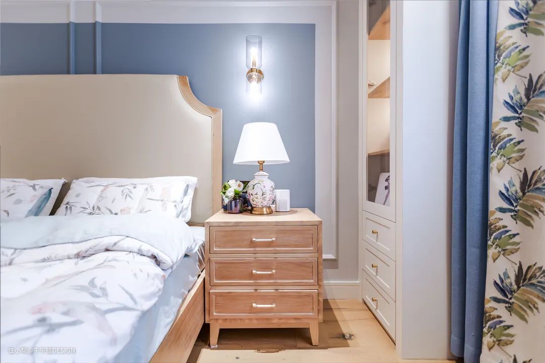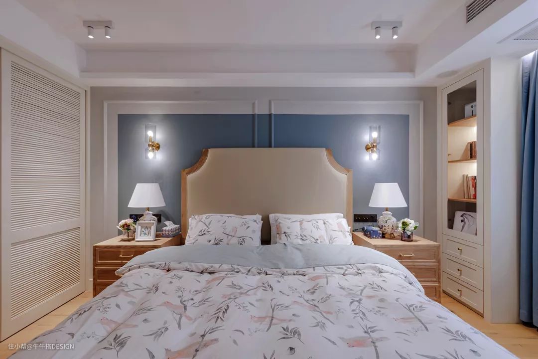 雾霾蓝背景墙,对称配置复古床头灯,仿佛丛林里的两盏温暖的烛灯。温暖的灯光打在床头,更加温馨。