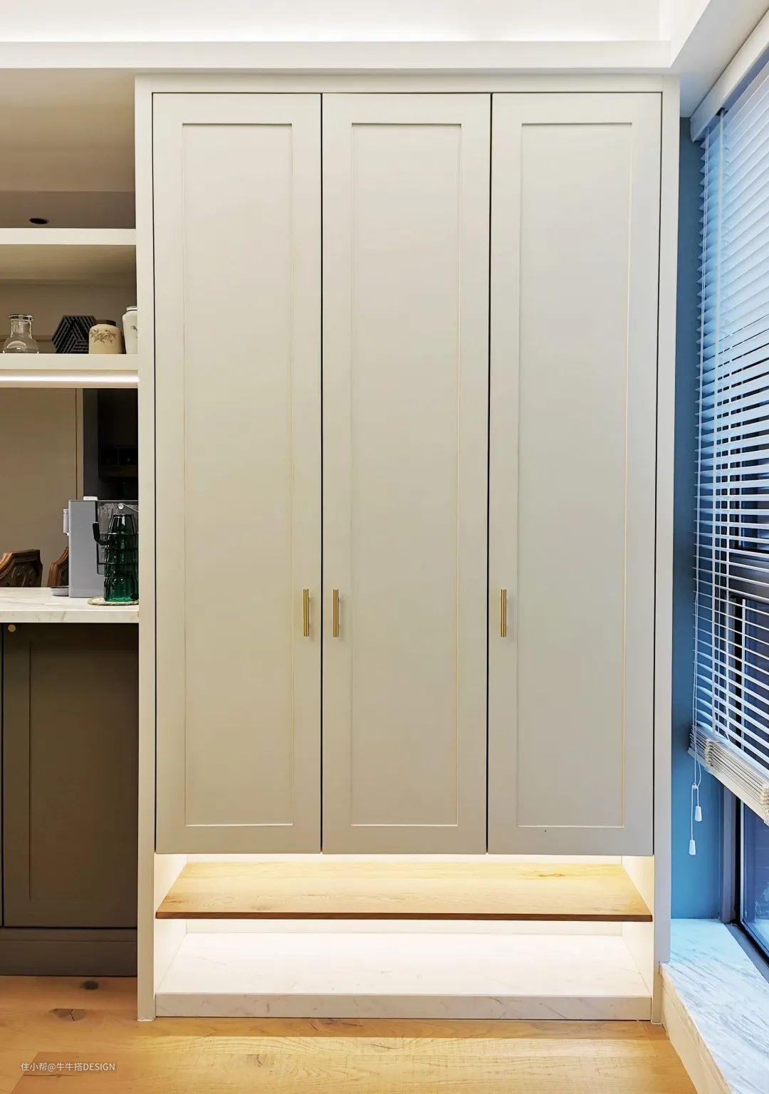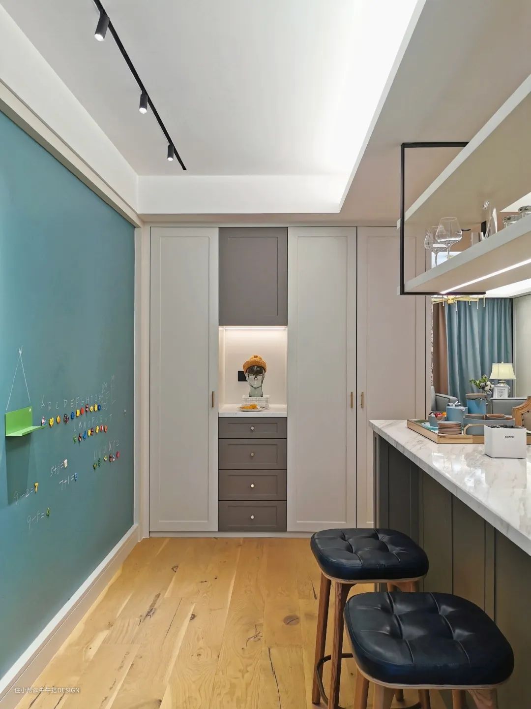 背面设计了一面大大的手绘磁吸绿板墙,记录一些家人的念想以及孩子的涂鸦,满满的亲子气息。过道尽头一排到顶储物柜,超大容量放置男女主人的物件,比如行李箱、孩子的平衡车、滑板车、吸尘器等等。下方三个抽屉各有分配,爸爸、妈妈、孩子各有分区。
