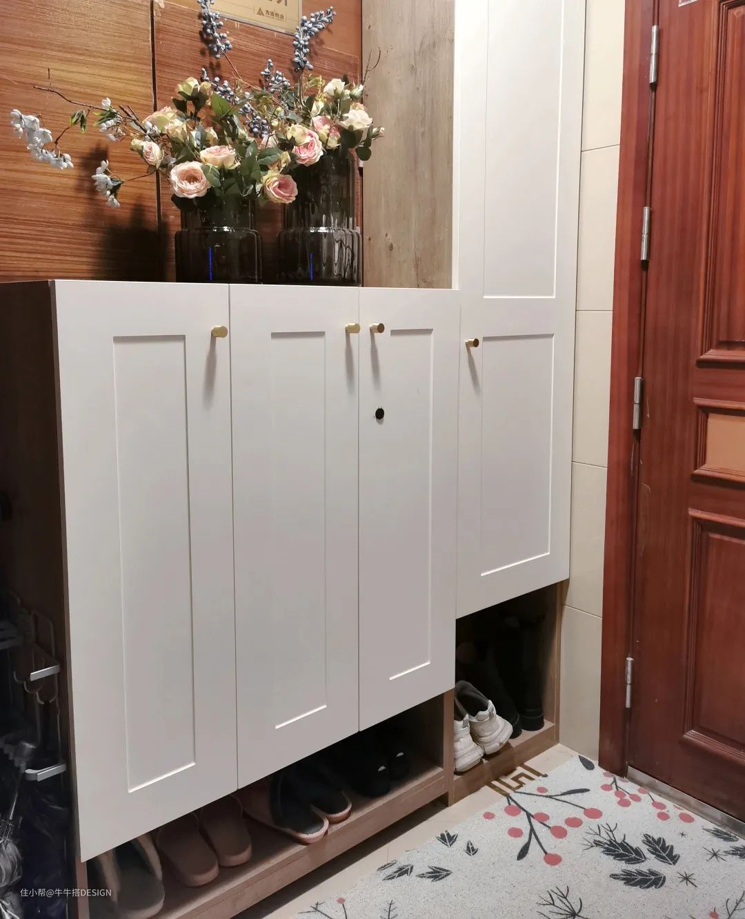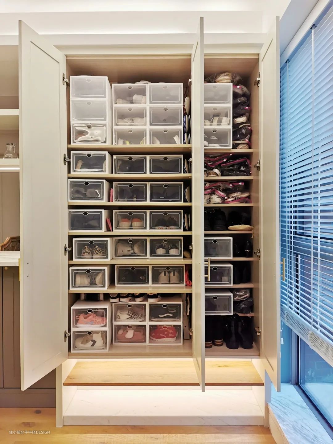 鞋柜做了男女主人和小孩的用鞋分区,落地的两排间隔,内置灯带方便取用。
