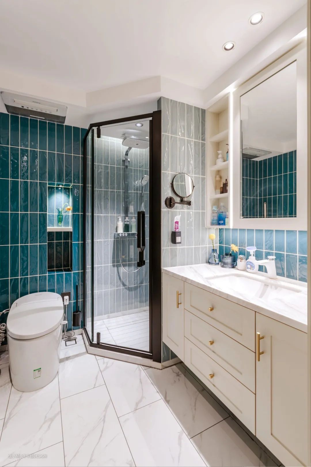 卫生间大背景色用了丛林墨绿,让洗漱室也多一份自然的情调。淋浴房隔开干湿分区,洗漱台镜面柜左右做了小格子收纳柜,方便早晚取用洗护,氛围灯让皮肤照的更加光彩。下沉内嵌台盆,台面轼湿水打理方便,台盆柜金属五金,有一种自然且又低调的奢华。