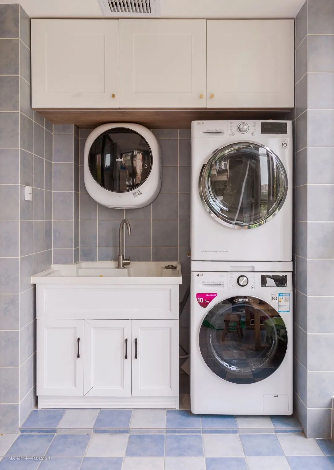 阳台安排了洗衣机、烘干机、儿童洗衣机一一俱全,再也不怕下雨的季节。手洗台盆可以洗漱日常贴身衣物,各个情景都考虑周全,顶柜可以放置储备的洗涤用品。