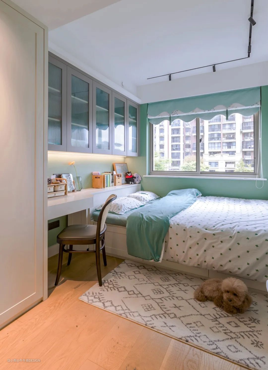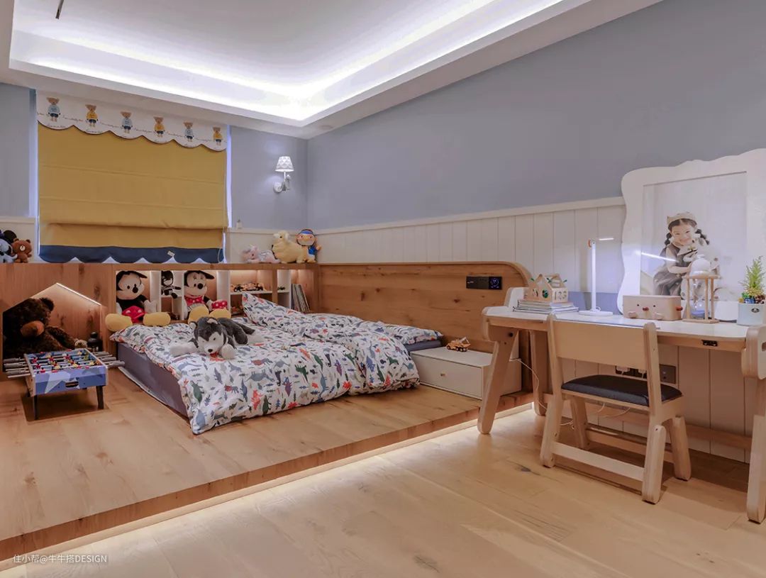 床位设计了顶柜和地柜,顶柜放置被褥床品,地柜同时也是书桌台连排延伸到飘窗格子台面,地柜抽拉式方便孩子取拿自己的玩具,书桌台扩展为学习区,顶柜底部安排了一排灯带光线柔和,充分考虑了孩子的视力保护。