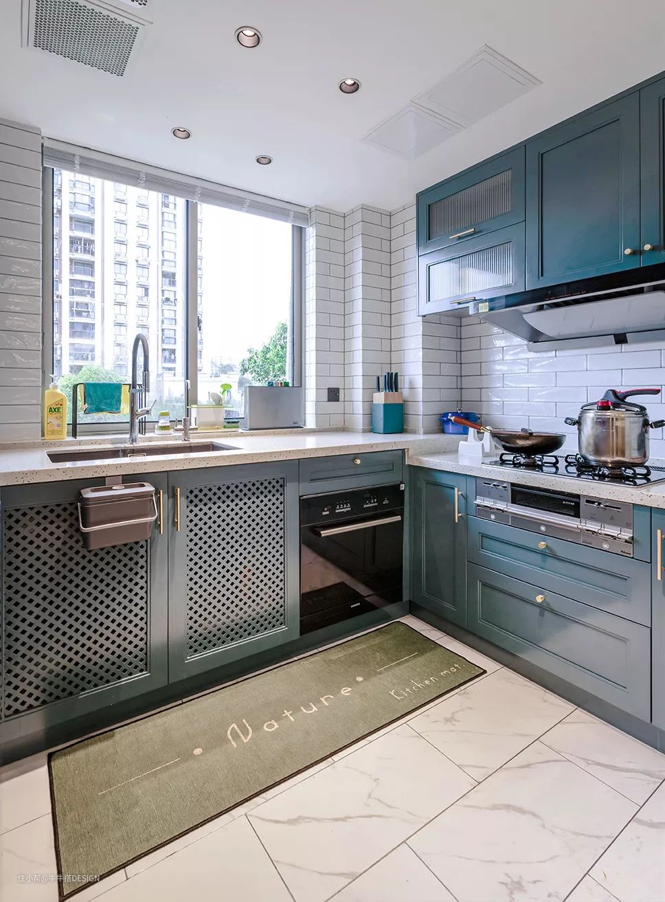 厨房自然元素整体呼应,一款灰蓝绿色的橱柜门板,加上小砖,让这个小空间变的生动,大单槽,水槽下透气的门板,一切为了使用出发,顶上装了空调,让夏天烧饭也能变成一种享受。