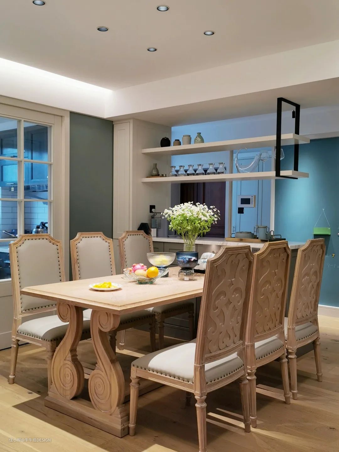 餐厅的桌子是靠着吧台来摆放的,和吧台形成高低错落感,客人多的时候也可以横过来放在中间。美式木雕结合皮艺,6人排餐椅,透出浓浓的田园复古风,亲友们举杯一起畅谈家常,不奢华且有内涵。