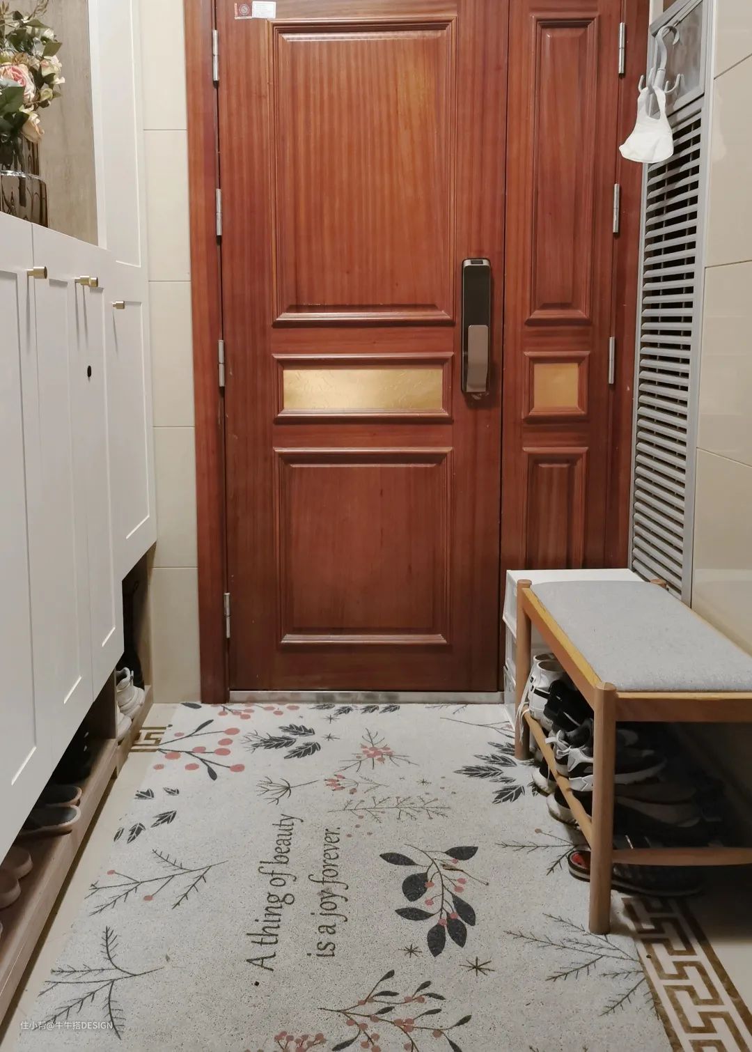 入户花园做了一排收纳鞋柜以及外套衣柜,首先常用的鞋都在门外完成,鞋柜后面是弱电的检修门,所以给鞋柜下面安装了可移动的滚轮,方便移动检修。这个空间设计让室外的风尘都在这里停歇,换取居家用鞋,把钥匙、办公包放下,同时也放下所有的疲惫,享受家的轻松和愉悦。