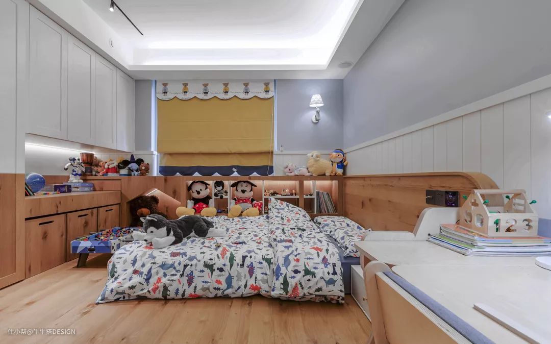 儿童房用了很多卡通元素结合自然实木,每个卡通玩具都有一个小小的屋子,孩子在房间最爱玩和toys过家家,睡觉时总会说我的邻居是米老鼠和大笨熊,游戏化的场景置入在孩子天真的烂漫中。