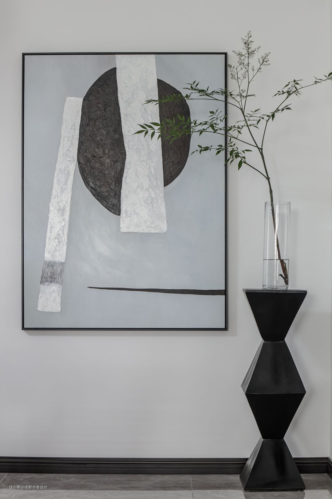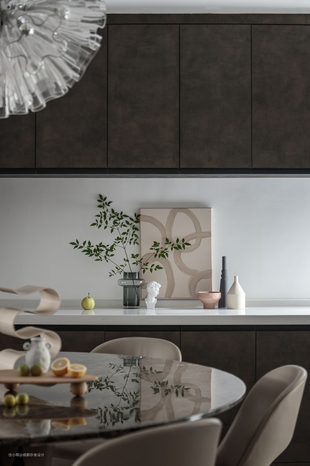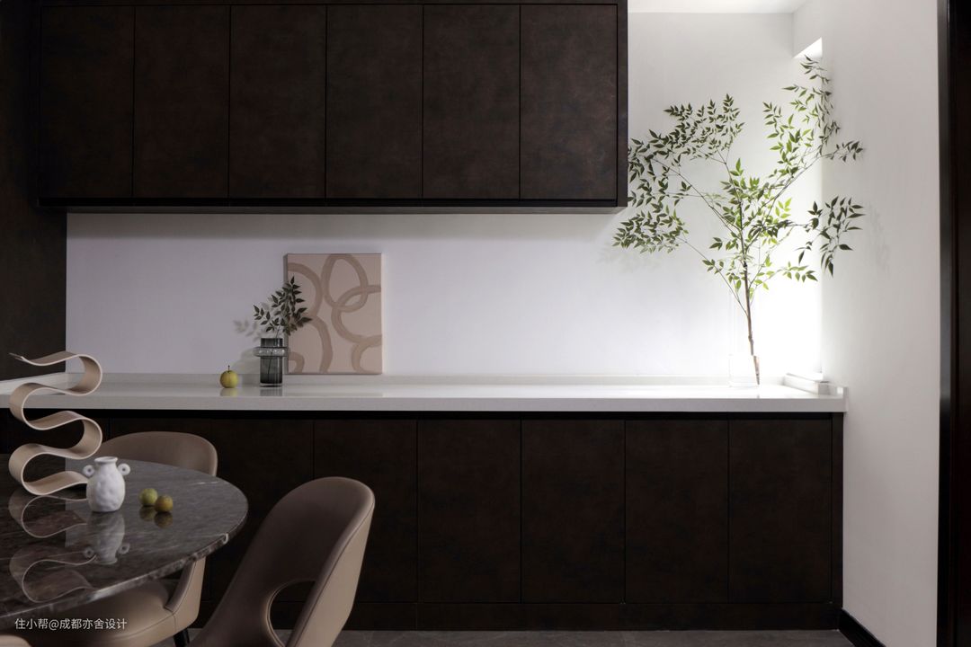 餐厅旁是卧室,于是我们利用空间转角交界处用打造出克制优雅的局部端景,给人一种“这里就是尽头“的错觉,空间层次分明且巧妙划分公私区域。#亦舍设计 #山有木兮 #餐厅 #装饰画