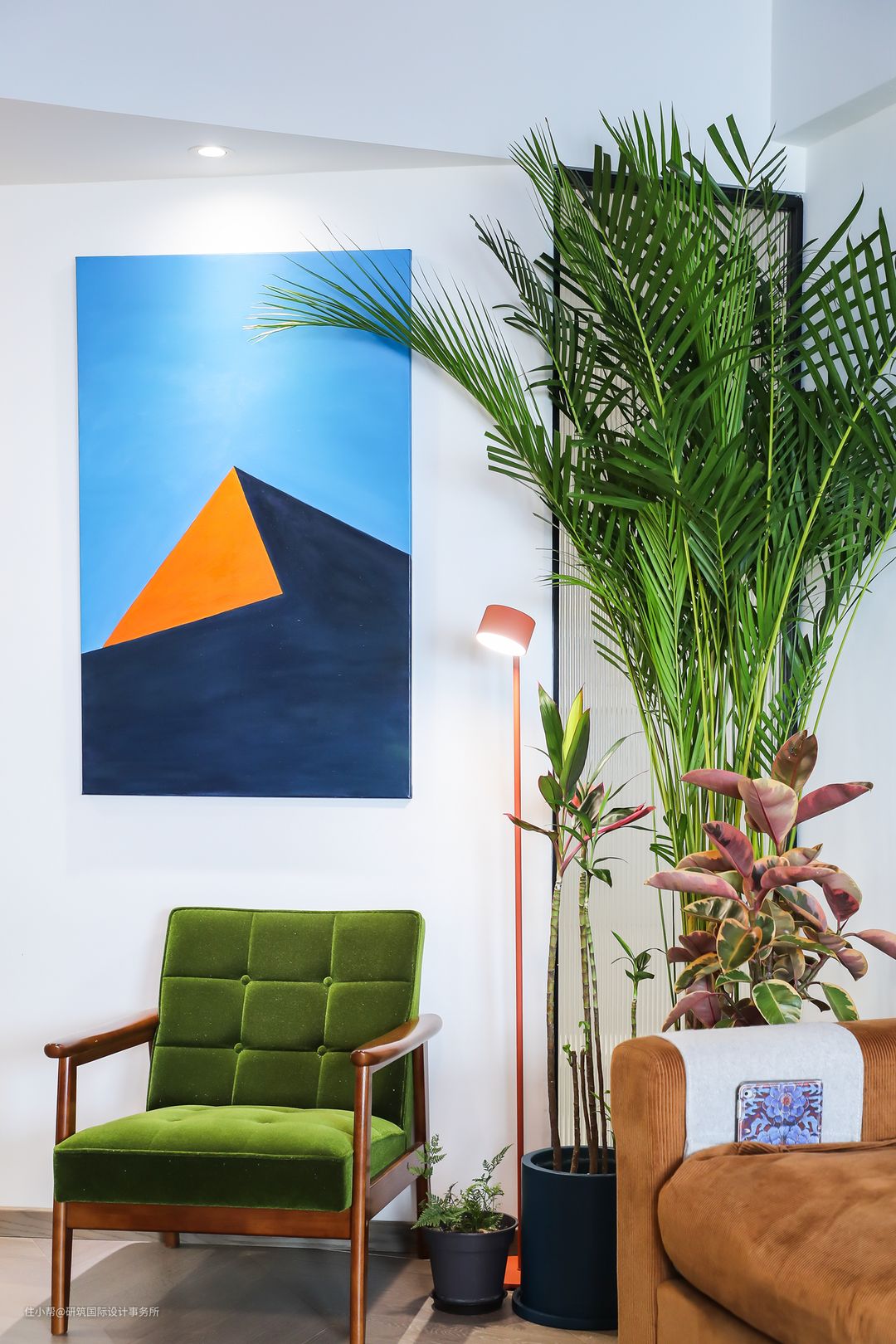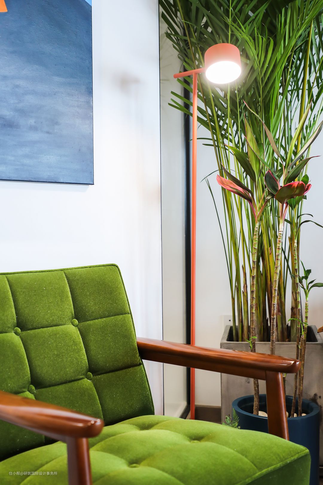 绿色亮绒质感的沙发椅,在客厅中起到了点睛之笔,随着光线反射,营造出怀旧的现代复古风情,提升整个空间的质感和格调,搭配简约橙的落地灯,以及绿植的陪伴,清新自然,优雅高级。