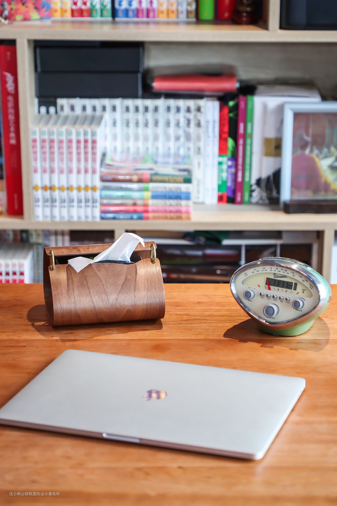 这是一个最有心机的设计点,说是餐厅,不妨说是书房、飘窗榻榻米都不为过; 一整面的背景墙做了书柜,开放式的格子架放书籍、以及装饰品,给生活增添了无限的文艺气息。完全满足男主的藏书需求,让办公与日常生活环境融合。#餐厅#餐桌#餐椅#樱桃木