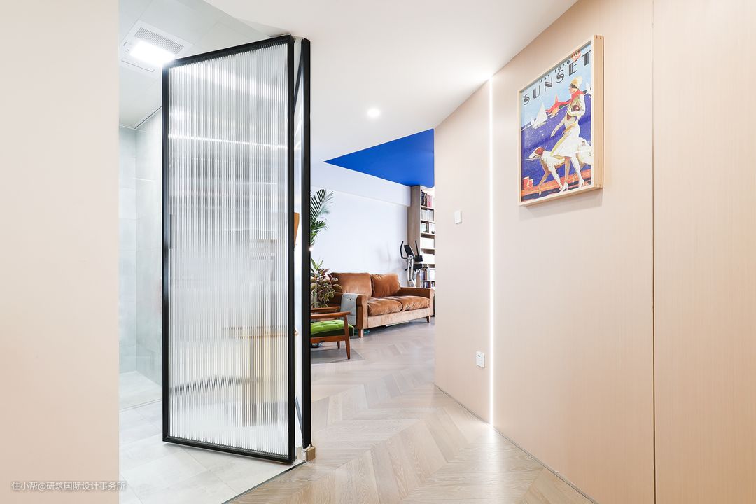 卫生间利用长虹玻璃代替墙面,其一让通过本身的材质将自然光引入卫生间内,制造通透明亮的效果;其二,由于空间的格局,可让空间之间存在视觉上的连通感,给予视觉上的扩大,不会显得小而压抑。#卫生间#长虹玻璃#三分离