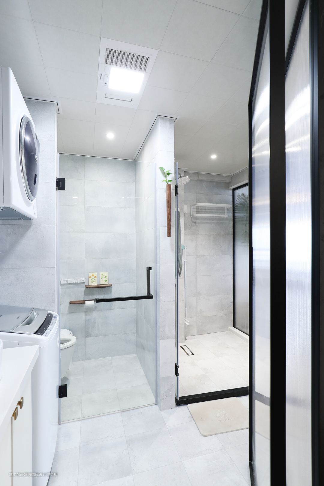 原布局卫生间呈狭长状,很不合理;优化设计,升级为三分离式,每一块区域都有足够的活动空间,保证使用起来的宽敞度和舒适度;整体的灰白墙砖和地砖,干净整洁,视觉亮度增加,搭配黑色窄边框长虹玻璃,质感和高级满满,精致的生活随处可见。#卫生间#三分离#干湿分离