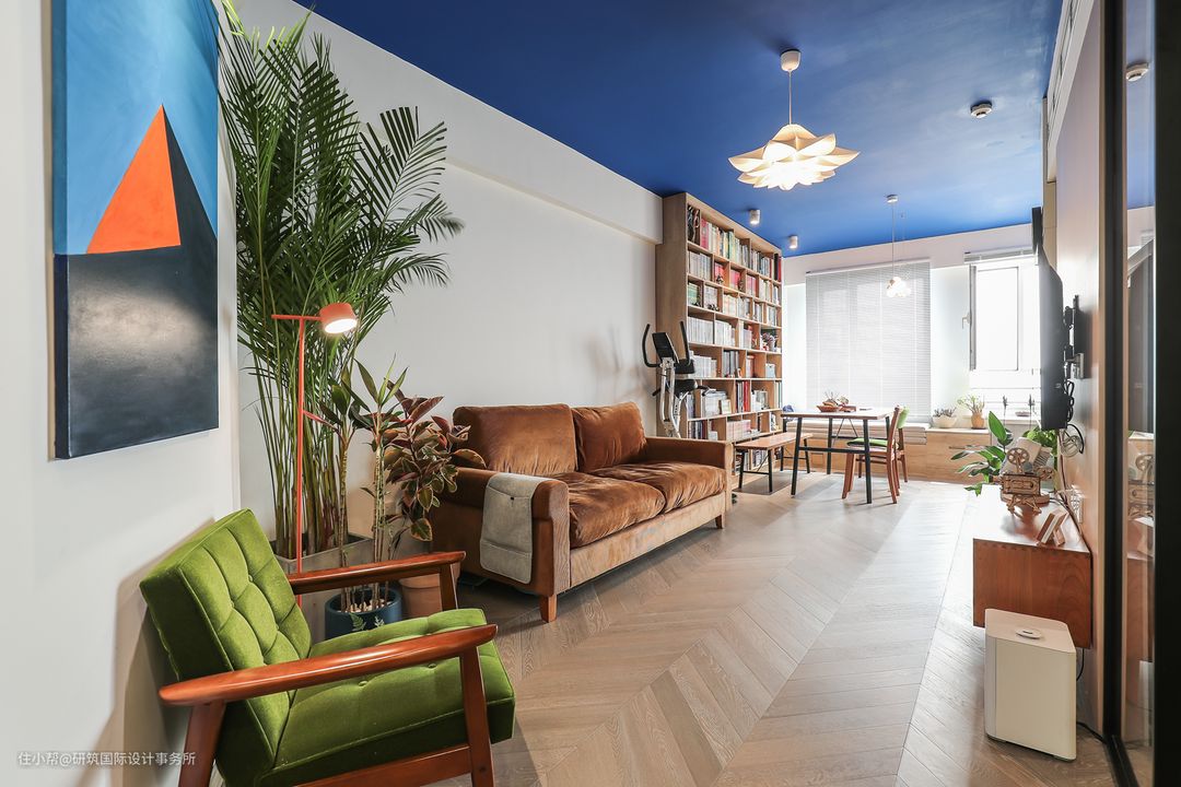 整个空间的格局相对全部开放,没有多余的墙体,为了的是让小户型空间看起来更加宽敞,采光更好,活动起来不局促。 客餐厅一体,保障了通常的采光,整体暖系的色调中,棕色条绒布沙发,人字拼木地板,绿色单椅的点缀,与蓝色顶面形成强烈的对比,冷暖在空间中相互缠绕、相互衬托,温润沉着又不失活力,来营造客厅的温馨感,整屋的人字拼地板,更富视觉震撼。#客厅#餐厅#沙发#落地灯