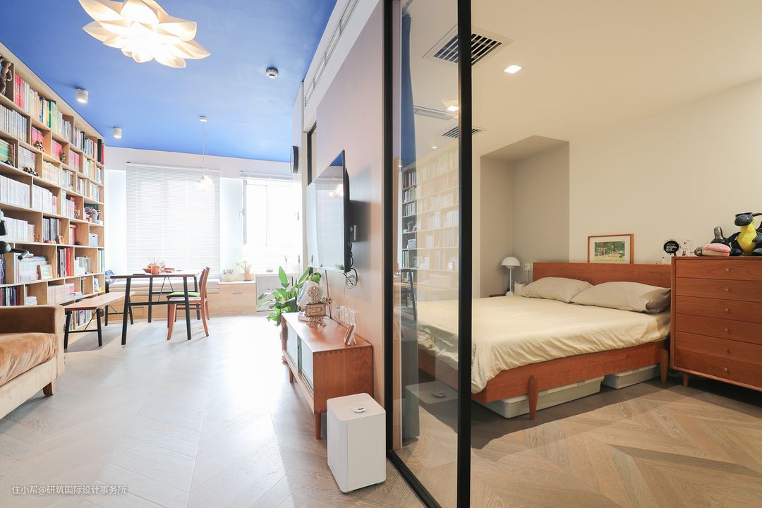 前后经过6稿,最后敲定的这套方案是紧扣“单尺度大”这条设计理念呈现的,在设计师看来,最后这稿方案在每个空间尺度上面来讲都可以与100平的房子相比较。 户型改造具体如下: (1)整个属于长方形户型,原始的缺陷便是没有隐私基础,站在门口便能将整个空间一览无余。如果独立设计一个玄关,对于小户型来说略微奢侈,所以设计师选择将玄关与走廊相结合,做了一个“曲径通幽”的处理,确保室内的隐私性。 (2)将走廊剩余空间做了三角形的储物间,增加储物收纳。 (3)基于玄关走廊的整体的结构,卫生间合理的改造为三分离式,使用便利。玻璃式的墙体,增加空间的通透性。 (4)卧室重新划分,利用玻璃的形式,让空间明亮舒适。 (5)客餐厅、厨房一体化,视觉上空间更大,动线方面也更加流畅,同时保障空间的采光。由于空间面积的问题,客厅无茶几设计,活动更自由。 (6)餐厅由书架、餐桌椅和飘窗组成,同时也是男主的办公区,满足男主的藏书需求,飘窗的作用在于隐藏折叠床,可以作为餐椅,休闲、看书、办公。 (7)开放式的U字型厨房格局,开间2m活动自由,高低台的设计,嵌入式的电器,满足日常生活的便利。