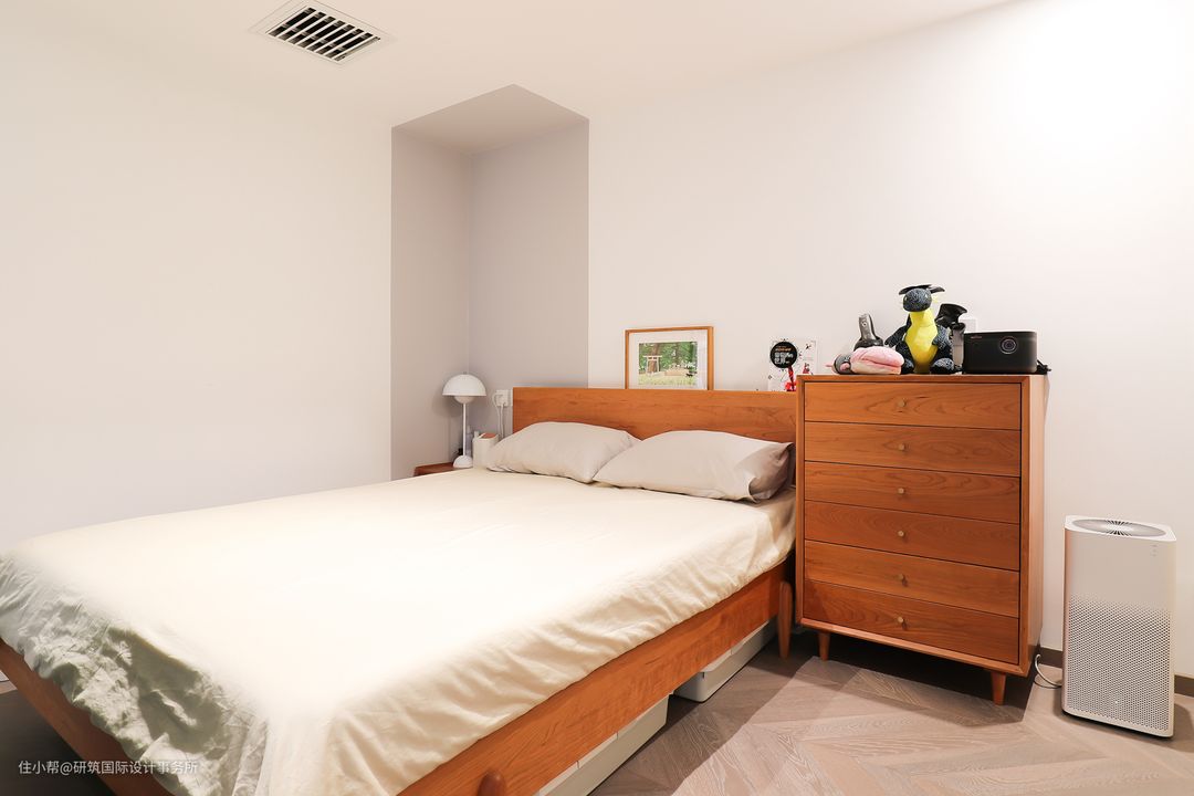 卧室简约而不简单,主以白色、樱桃木色为主,墙面做了分色处理,墙角富有立体感的浅灰色点缀,让墙面颜色富有变化而不单调,搭配樱桃木的主体床与五斗柜,凸显宁静安逸、温润舒适,一副舒适的生活画卷徐徐展开。#卧室#床#斗柜