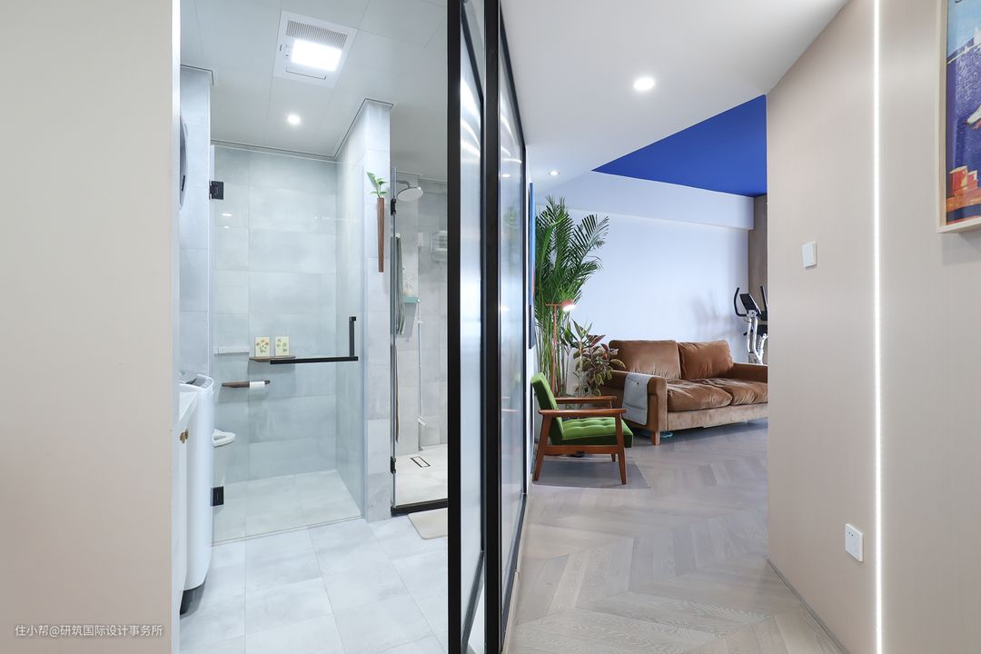 卫生间利用长虹玻璃代替墙面,其一让通过本身的材质将自然光引入卫生间内,制造通透明亮的效果;其二,由于空间的格局,可让空间之间存在视觉上的连通感,给予视觉上的扩大,不会显得小而压抑。#卫生间#长虹玻璃#三分离