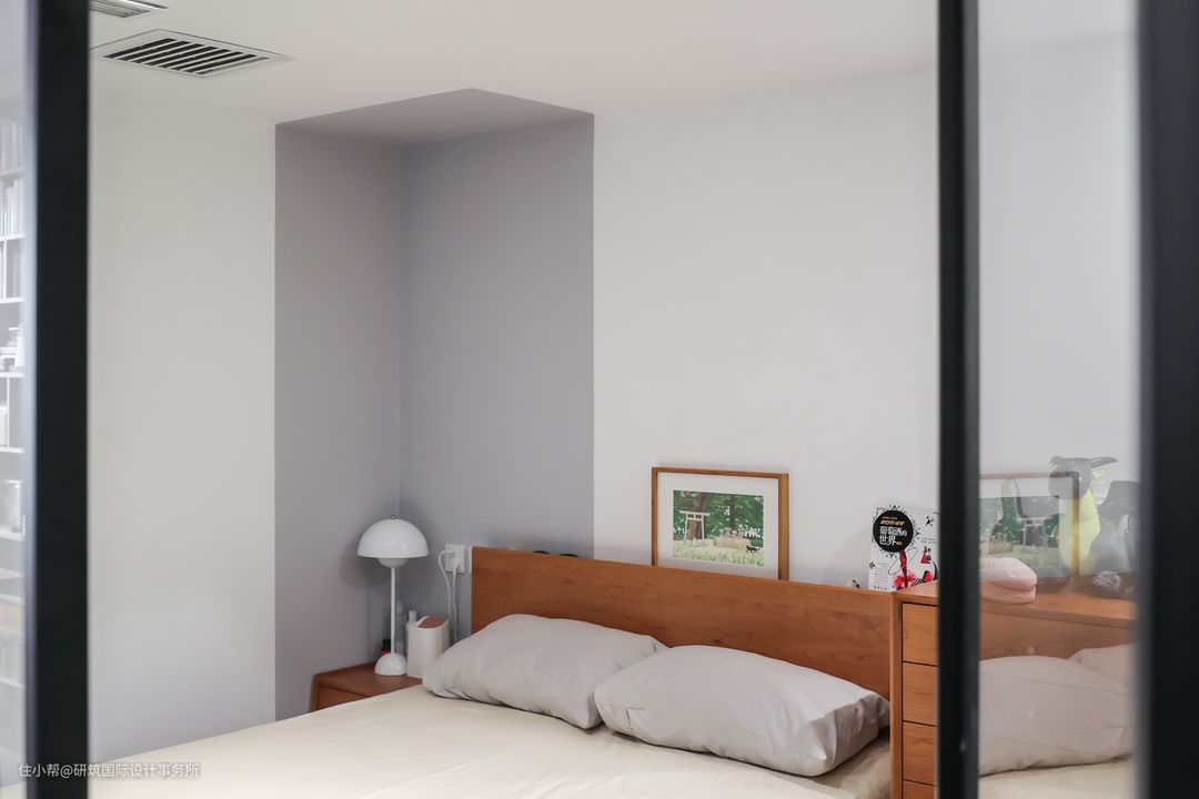 利用墙面和玻璃结合的形式,将卧室与客厅相隔,窄边的门框结构也显得空间更加利落,与整个斜形的结构设计相匹配,同时玻璃的形式,让卧室空间避免压抑,借助光源,显得通透明亮。#卧室