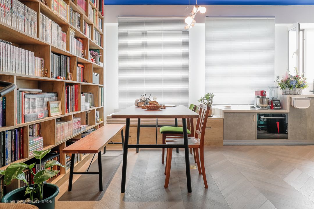 这是一个最有心机的设计点,说是餐厅,不妨说是书房、飘窗榻榻米都不为过; 一整面的背景墙做了书柜,开放式的格子架放书籍、以及装饰品,给生活增添了无限的文艺气息。完全满足男主的藏书需求,让办公与日常生活环境融合。#餐厅#餐桌#餐椅#樱桃木