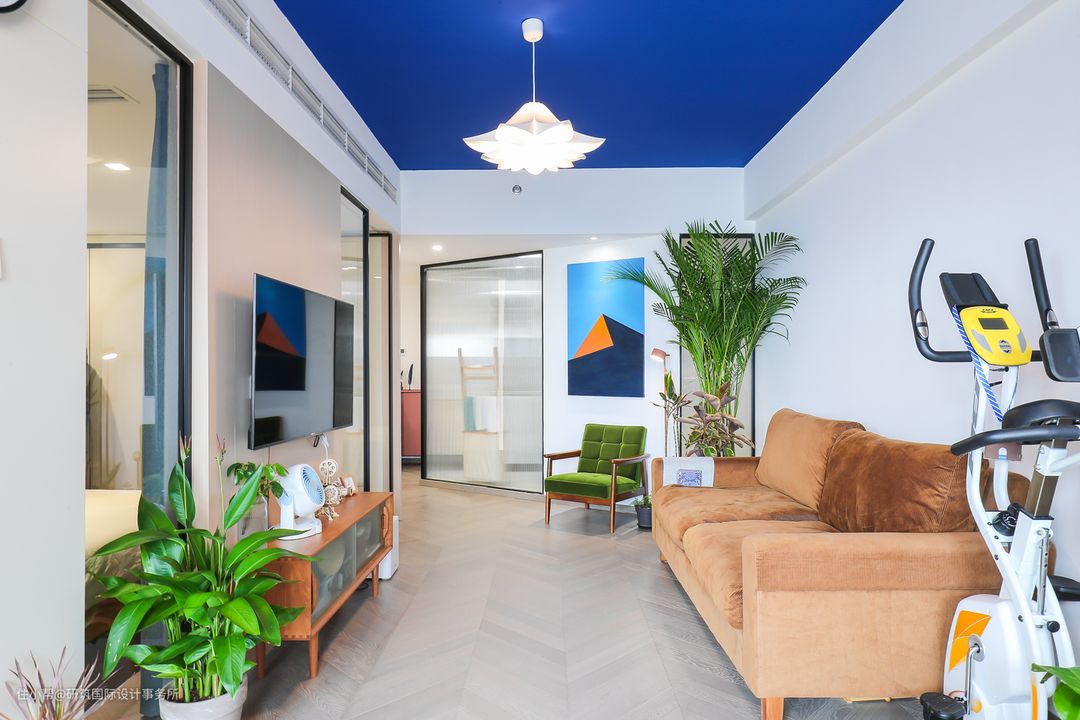 靓丽的宝蓝色顶面处理,大大增加了空间的视觉冲击力,带来视觉上的清爽,清凉过渡一夏。 由于空间格局,客厅放置茶几,会显得空间局促,活动起来不便,再加上业主平常在客厅待得时间不多,所以最终不设茶几,若后期需要,可购买小型轻巧的茶几,也是比较方便的。#客厅#沙发#电视柜