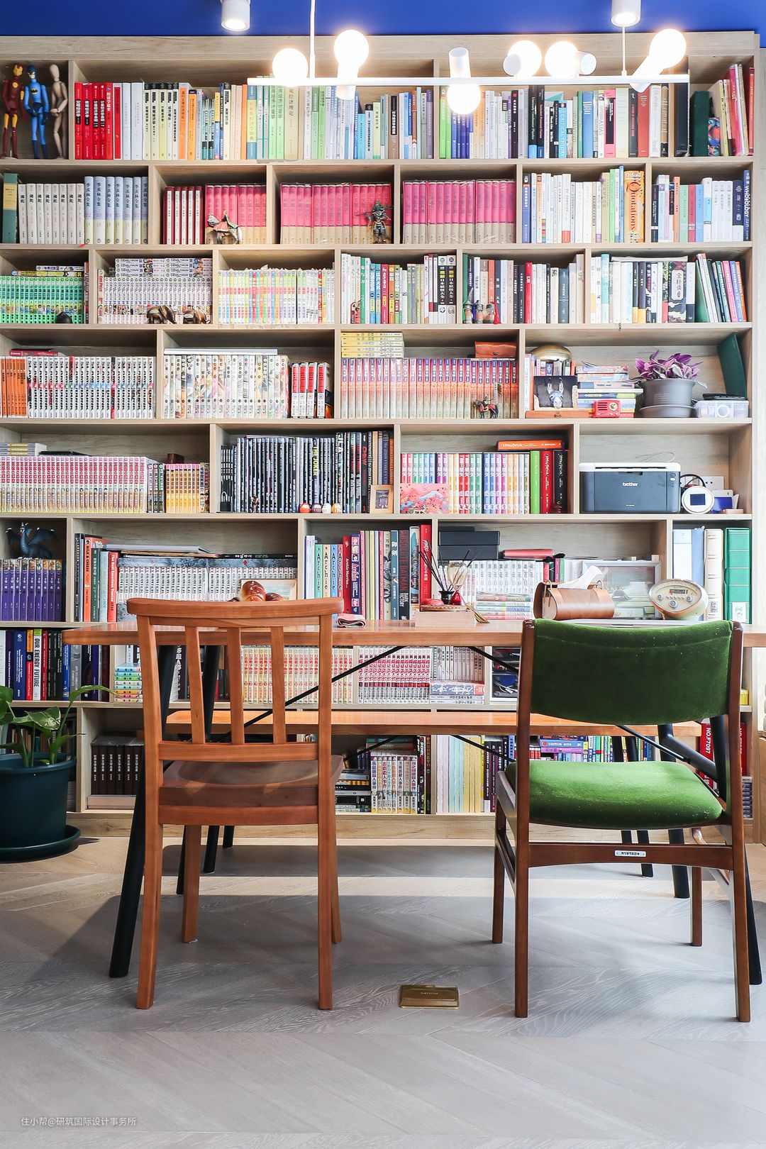 这是一个最有心机的设计点,说是餐厅,不妨说是书房、飘窗榻榻米都不为过; 一整面的背景墙做了书柜,开放式的格子架放书籍、以及装饰品,给生活增添了无限的文艺气息。完全满足男主的藏书需求,让办公与日常生活环境融合。#餐厅#餐桌#餐椅#樱桃木